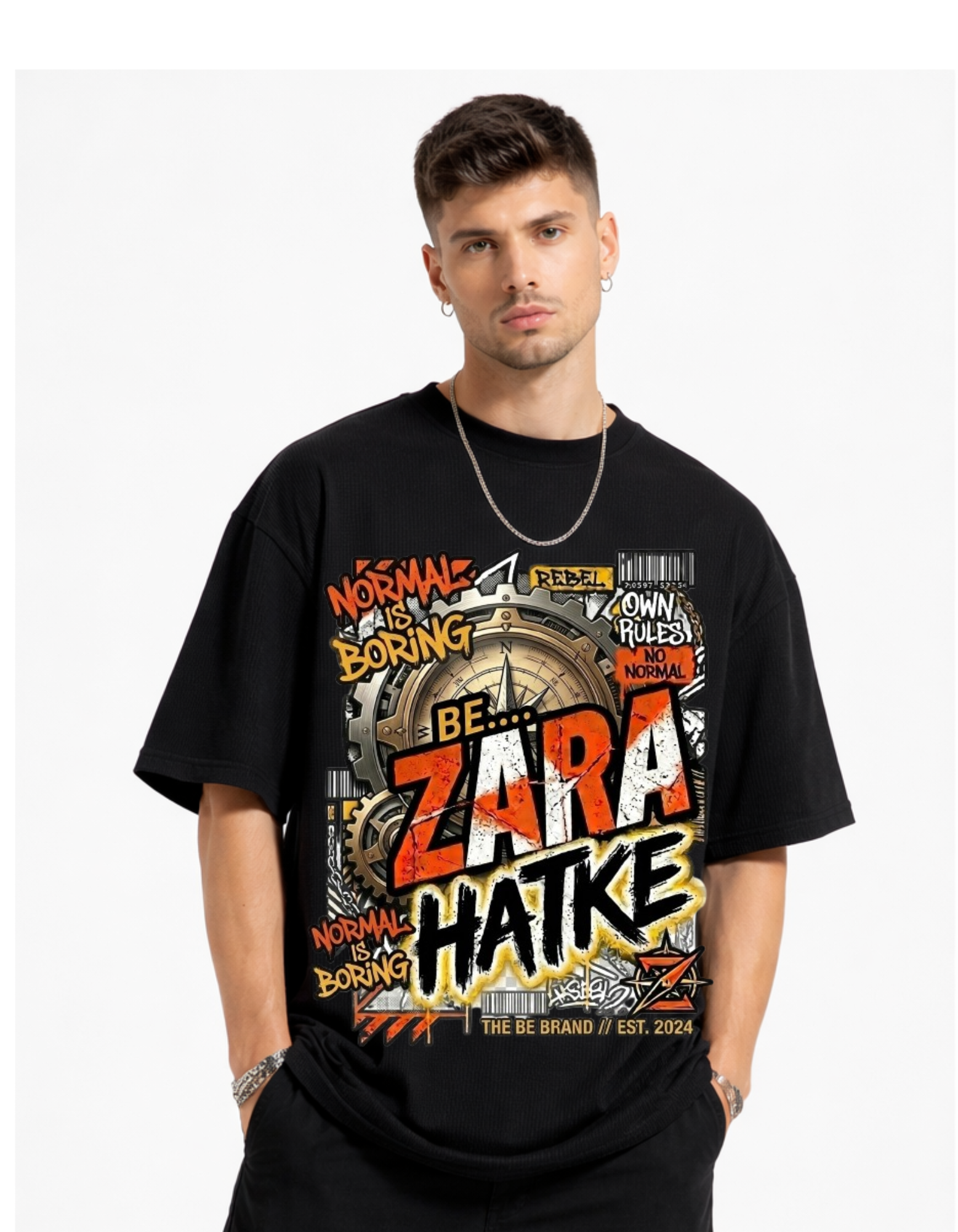 Men’s Oversize T shirt Be Zara Hatke : Break free from the ordinary. This isn’t just a T-shirt—it’s an attitude. The “Normal is Boring. Be Zara Hatke” oversized tee is made for men who don’t follow trends—they create them.